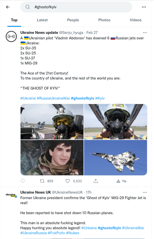 Ce que l’on ne peut nier cependant, c’est que l’idée du fantôme de Kiev a saisi les utilisateurs des médias sociaux, en particulier les partisans inconditionnels de l’Ukraine […].