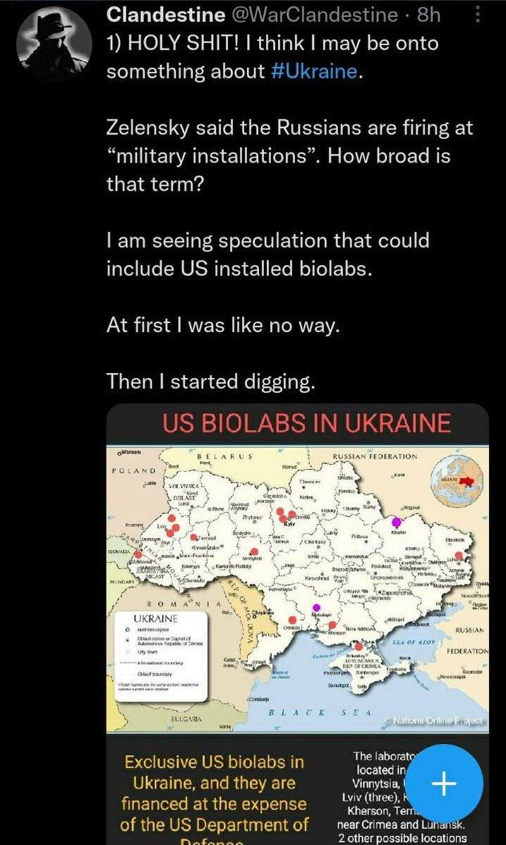 « CyberBerkut continue de suivre les activités secrètes des services spéciaux américains et des organisations non gouvernementales en Ukraine », a déclaré le groupe dans un communiqué, publié sur son site Web jeudi. « Récemment, des épidémies de maladies rares pour notre pays ont été activement discutées sur le web. De nombreux Ukrainiens pensent qu’elles ont été causées par des expériences secrètes sur des micro-organismes pathogènes, menées dans des laboratoires biologiques américains situés dans différentes villes de notre pays. Au total, 15 installations de ce type, financées par les États-Unis, ont été construites dans notre pays depuis 2009 dans le but supposé de réduire les menaces biologiques. »
