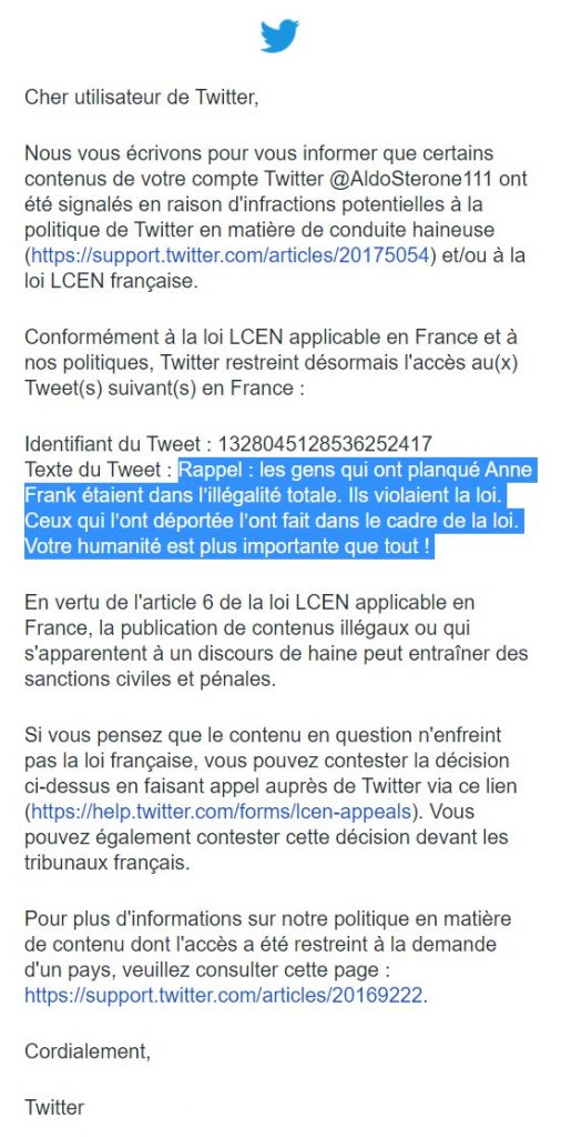 Et voici le contenu du message de Twitter :