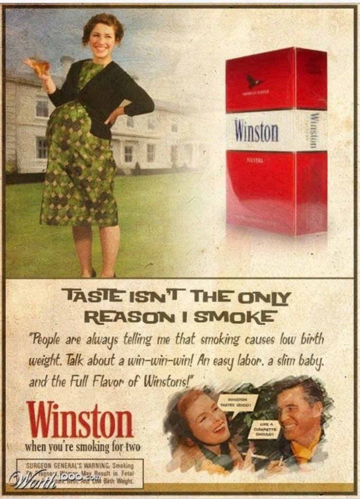 Je ne fume pas que pour le goût – « Les gens me disent toujours que fumer réduit le poids du bébé. C’est gagnant-gagnant ! L’enfant sort facilement, il est svelte et j’ai le goût complet des Winston ! »