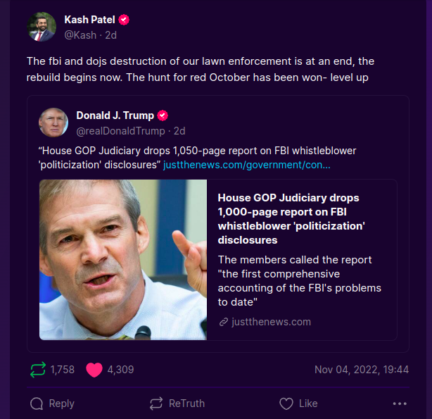 La destruction par le FBI et le DOJ de notre application des lois sur les pelouses est terminée, la reconstruction commence maintenant. La poursuite d’Octobre rouge a été gagnée – au niveau supérieur. (Kash Patel)