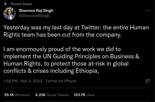 Hier était mon dernier jour chez Twitter : toute l’équipe chargée des droits de l’homme a été retirée de l’entreprise.