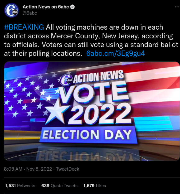 Toutes les machines à voter sont hors service dans chaque district du comté de Mercer, dans le New Jersey, selon les autorités. Les électeurs peuvent toujours voter en utilisant un bulletin standard dans leurs bureaux de vote.