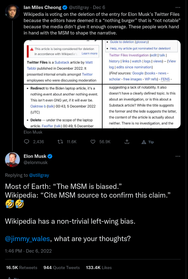 Wikipedia est en train de voter la suppression de l’entrée pour les fichiers Twitter d’Elon Musk parce que les éditeurs ont estimé qu’il s’agissait d’un « rien du tout » qui n’est « pas notable » parce que les médias ne lui ont pas donné assez de couverture. Ces personnes travaillent main dans la main avec les MSM pour façonner le récit.