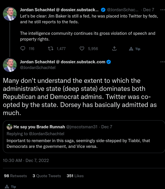Beaucoup ne comprennent pas à quel point l’État administratif (État profond) domine les administrateurs républicains et démocrates. Twitter a été coopté par l’État. Dorsey l’a pratiquement admis.