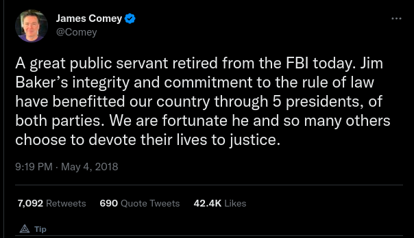 Un grand fonctionnaire a pris sa retraite du FBI aujourd’hui. L’intégrité de Jim Baker et son engagement en faveur de l’État de droit ont profité à notre pays sous cinq présidents, des deux partis. Nous avons de la chance que lui et tant d’autres aient choisi de consacrer leur vie à la justice.