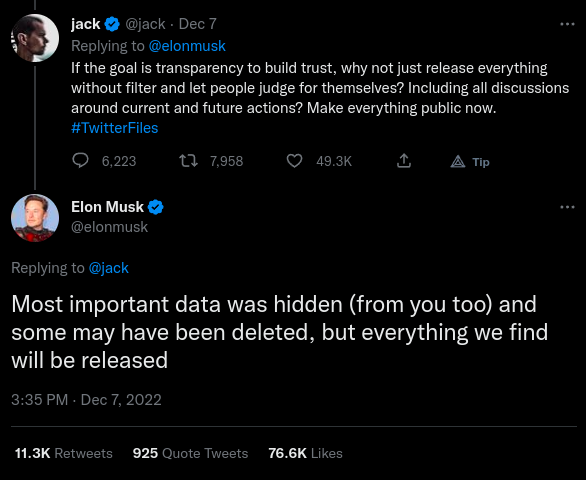 Jack Dorsey: Si le but est la transparence pour établir la confiance, pourquoi ne pas tout publier sans filtre et laisser les gens juger par eux-mêmes ? Y compris toutes les discussions autour des actions actuelles et futures ? Rendez tout public maintenant. #TwitterFiles
