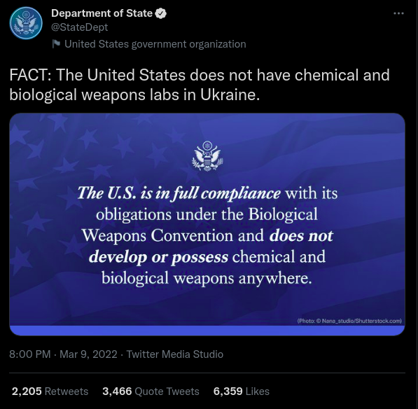 Nous avons contacté le Département d’Etat séparément et ils nous ont fourni cette déclaration très soigneusement formulée : « Le ministère américain de la Défense ne possède ni ne gère de laboratoires biologiques en Ukraine. Lors de son témoignage, la sous-secrétaire Nuland faisait référence aux laboratoires ukrainiens de diagnostic et de biodéfense, qui ne sont pas des installations d’armes biologiques.[…]Ces institutions contrent les menaces biologiques dans tout le pays. »