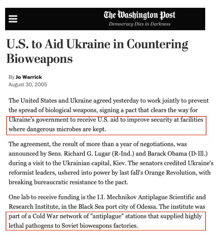 - Que font-ils exactement dans ces laboratoires biologiques ukrainiens secrets ? L’Ukraine est le pays le plus pauvre d’Europe. C’est difficilement un foyer de recherche biomédicale. Nous supposons que ce ne sont pas des laboratoires pharmaceutiques, qui ne développent probablement pas de nouveaux médicaments contre la leucémie. D’après votre réponse, Victoria Nuland, nous supposons […] qu’il y a une application militaire à cette recherche, qu’ils travaillent sur des armes biologiques.