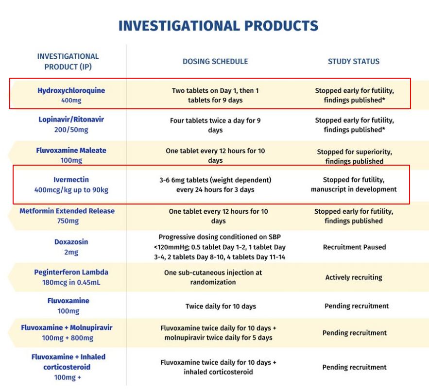 RĂ©sultats Dans cet essai qui a inclus 685 patients, les taux d’hospitalisation associĂ©s au COVID-19 chez les patients traitĂ©s par l’hydroxychloroquine ou le lopinavir-ritonavir n’Ă©taient pas significativement diffĂ©rents de ceux des patients ayant reçu un placebo.[…] L’essai a Ă©tĂ© arrĂȘtĂ© aprĂšs l’analyse intermĂ©diaire pour cause de futilitĂ© avec un Ă©chantillon de 685 patients.