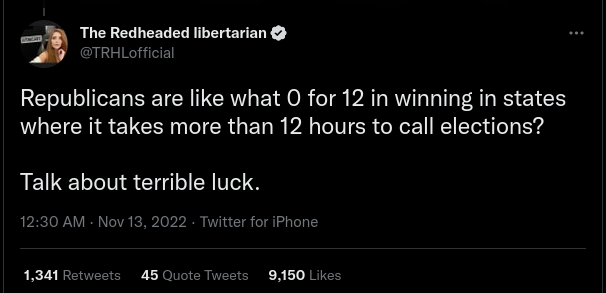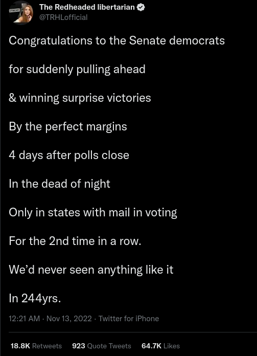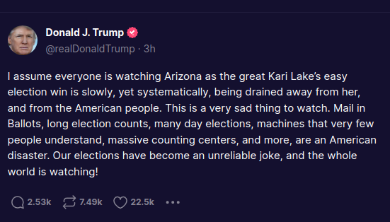 Je suppose que tout le monde observe l’Arizona alors que la victoire Ă©lectorale facile de la grande Kari Lake lui Ă©chappe lentement, mais systĂ©matiquement, ainsi qu’au peuple amĂ©ricain. C’est une chose trĂšs triste Ă regarder. Les bulletins de vote par correspondance, les longs dĂ©comptes Ă©lectoraux, les Ă©lections sur plusieurs jours, les machines que trĂšs peu de gens comprennent, les centres de comptage massifs, et plus encore, sont un dĂ©sastre amĂ©ricain. Nos Ă©lections sont devenues une blague peu fiable, et le monde entier nous regarde !