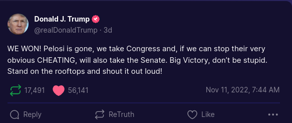 NOUS AVONS GAGNE ! Pelosi est partie, nous prenons le CongrĂšs et, si nous pouvons arrĂȘter leur tricherie trĂšs Ă©vidente, nous prendrons aussi le SĂ©nat. Grande victoire, ne soyez pas stupides. Montez sur les toits et criez-le haut et fort !