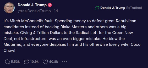 C’est la faute de Mitch McConnell. DĂ©penser de l’argent pour dĂ©faire de grands candidats rĂ©publicains au lieu de soutenir Blake Masters et d’autres Ă©tait une grosse erreur. Donner 4 trillions de dollars Ă la gauche radicale pour le Green New Deal, et non pour les infrastructures, Ă©tait une erreur encore plus grande. Il a fait Ă©chouer les Ă©lections de mi-mandat, et tout le monde le mĂ©prise, lui et sa charmante Ă©pouse, Coco Chow !