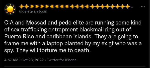 La CIA, le Mossad et l’élite pédophile dirigent une sorte de trafic sexuel et de chantage à partir de Porto Rico et des îles des Caraïbes. Ils vont me piéger avec un ordinateur portable placé par mon ex-femme qui était une espionne. Ils vont me torturer à mort.