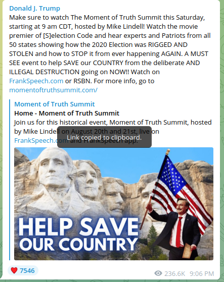 Ne manquez pas de regarder le sommet « Moment of Truth » ce samedi, à partir de 9 h CDT, animé par Mike Lindell ! Regardez la première du film [S]election Code et écoutez les experts et les patriotes des 50 états qui montrent comment les élections de 2020 ont été truquées et volées et comment empêcher que cela ne se reproduise. Un événement à voir absolument pour aider à sauver notre pays de la DESTRUCTION délibérée et illégale en cours MAINTENANT ! Regardez sur FrankSpeech.com ou RSBN. Pour plus d’informations, rendez-vous sur momentoftruthsummit.com/