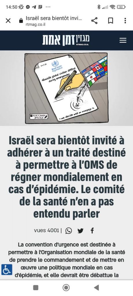 La commission santé de la Knesset (en gros, le parlement) a appris avec stupéfaction l’intention du ministère de la santé israélienne de signer un accord de transfert de compétence vers l’OMS en cas de crise sanitaire, sans en informer le parlement et encore moins les citoyens …