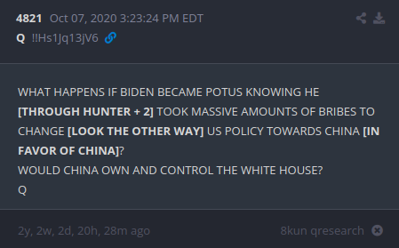 QUE SE PASSERAIT-IL SI BIDEN DEVENAIT POTUS EN SACHANT QU’IL [PAR L’INTERMÉDIAIRE DE HUNTER + 2] A REÇU DES MONTANTS MASSIFS DE POTS-DE-VIN POUR CHANGER [DÉTOURNER LE REGARD] LA POLITIQUE AMÉRICAINE ENVERS LA CHINE [EN FAVEUR DE LA CHINE] ?