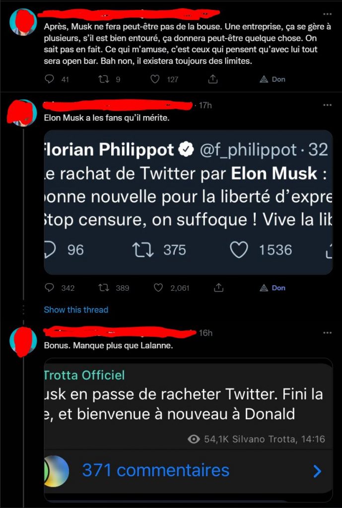 Ils sont aveugles et ne voient pas qu’il n’y a que les fascistes qui censurent les autres… Mais le monde le voit de plus en plus. Les États ne pourront plus se cacher derrière Twitter pour leur censure. Ils vont devoir s’en occuper eux mêmes. Cela dévoile pas mal de choses…