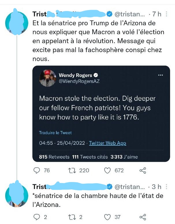 Bien sûr qu’il y a eu fraude mais pas seulement dans les chiffres. Toute l’élection était une fraude. Passer Zelensky qui dit aux français de voter Macron juste avant le dernier débat, un président qui a utilisé sa place pour éliminer les autres candidats sans faire campagne (scandale des signatures), des rumeurs à la con pour faire peur aux médias alternatifs afin qu’ils ne commentent pas trop les débats et les élections…