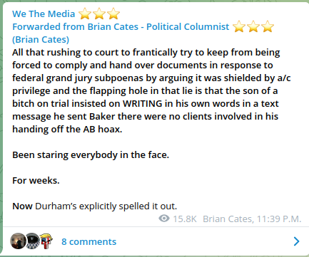Toute cette ruée vers le tribunal pour essayer frénétiquement d’éviter d’être forcé de se conformer et de remettre des documents en réponse aux assignations du grand jury fédéral en arguant qu’il était protégé par le privilège avocat/client et le trou dans ce mensonge est que le fils de p*** jugé a insisté pour ÉCRIRE dans ses propres mots dans un SMS qu’il a envoyé Baker qu’il n’y avait pas de clients impliqués dans sa remise du canular AB.