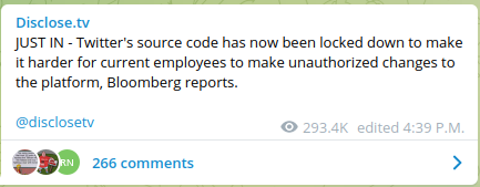 JUST IN – Le code source de Twitter a été verrouillé pour empêcher les employés actuels d’apporter des modifications non autorisées à la plateforme, rapporte Bloomberg. (source)