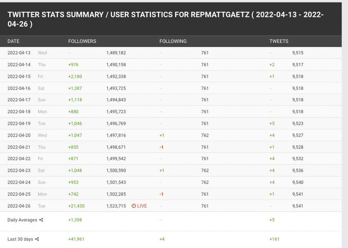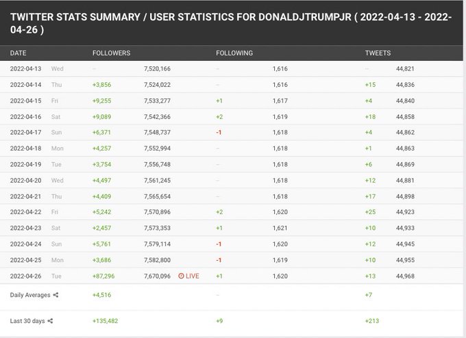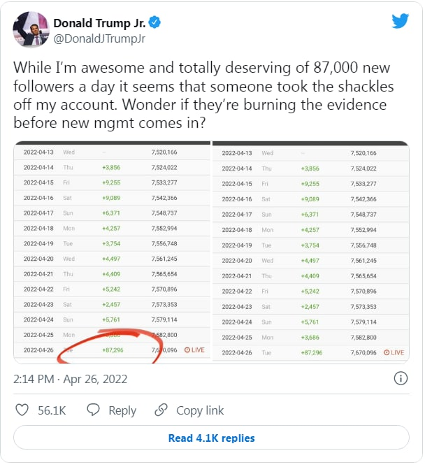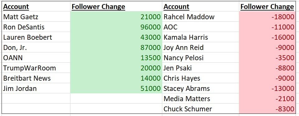 Les comptes Twitter des Républicains ont connu une augmentation massive du nombre de leurs adeptes après l’annonce lundi que Twitter était sur le point de se vendre à Elon Musk, tandis que les comptes des législateurs démocrates ont considérablement diminué, selon une analyse effectuée mardi par USA Today. Twitter a affirmé que les variations sauvages du nombre de followers sont organiques et résultent simplement de la création de nouveaux comptes et de la désactivation de comptes existants.