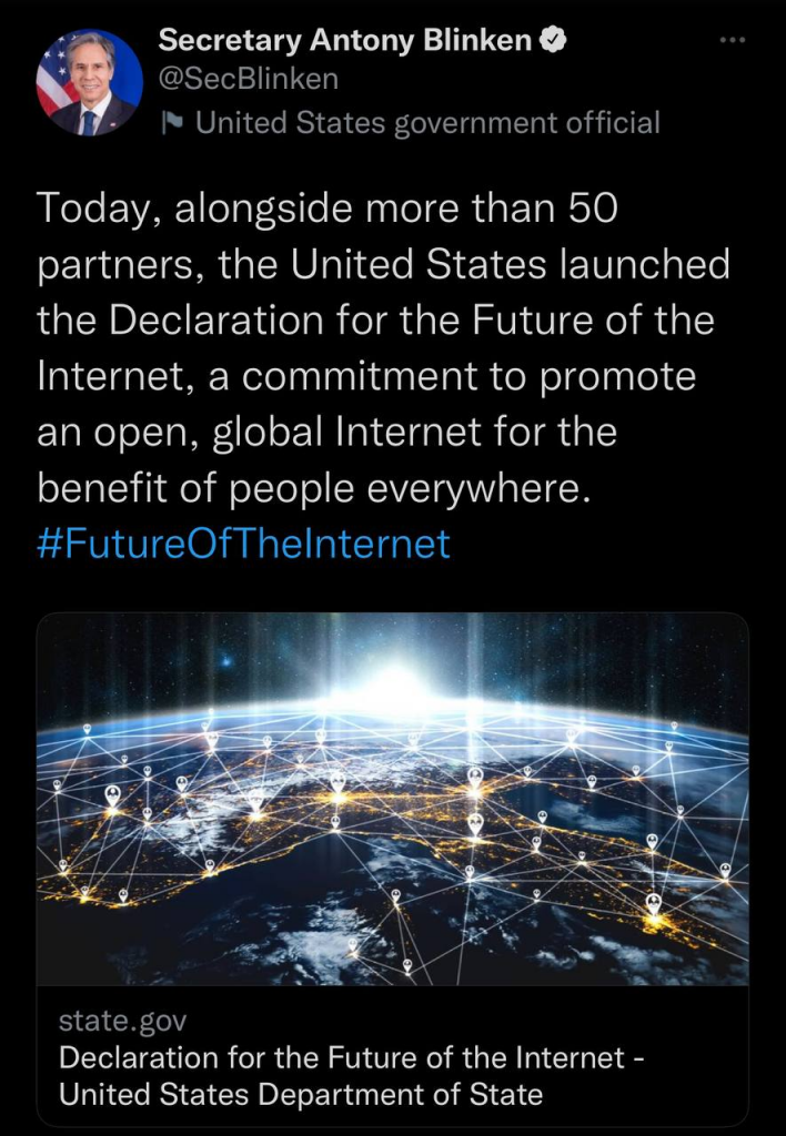 Aujourd’hui, aux côtés de plus de 50 partenaires, les États-Unis ont lancé la Déclaration pour le futur de l’Internet, un engagement à promouvoir un Internet ouvert et mondial au bénéfice des personnes partout dans le monde. #FutureOfTheInternet