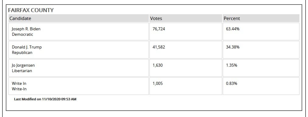 Une autre entrée pour le comté de Fairfax était située dans le district 10 du Congrès, où le comté de Fairfax apparaît avec 77 000 voix pour Biden.