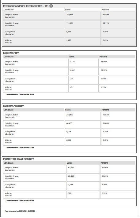 Le district du Congrès 11 comprend la ville de Fairfax et le comté de Fairfax ainsi que le comté de Prince William. Le nombre total de voix pour Biden est de 281 000 voix, dont 61 000 pour le comté de Prince William :