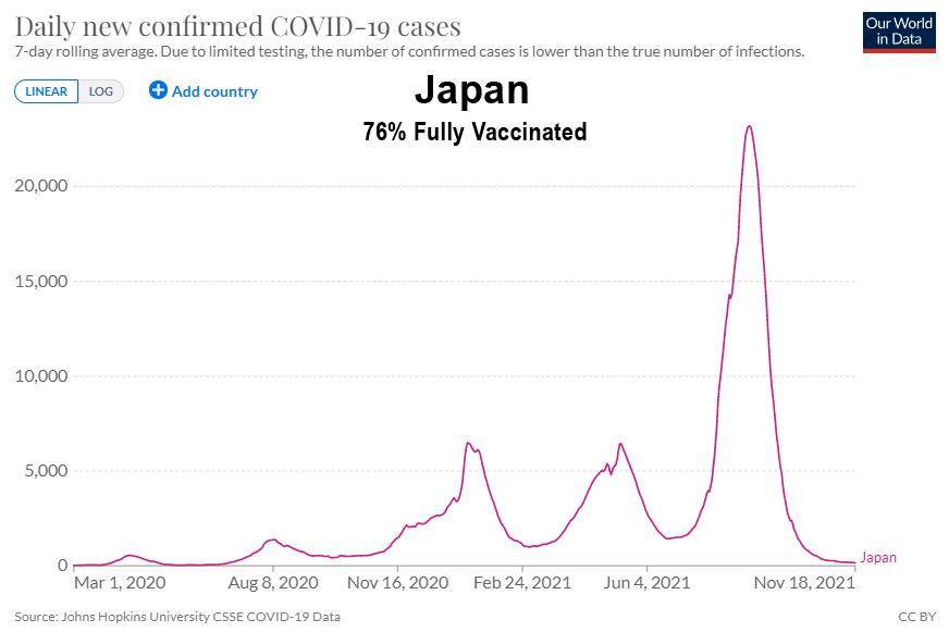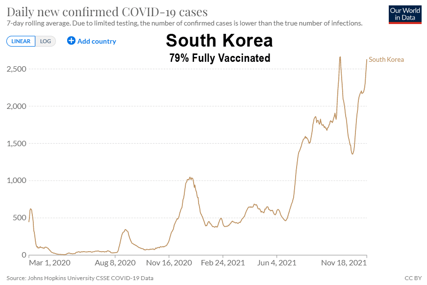 Comme vous pouvez le constater, malgré les campagnes de vaccination de masse, les masques obligatoires et les passeports vaccinaux déployés dans de nombreux pays européens, les cas atteignent aujourd’hui leur niveau le plus élevé, et ce n’est que le début de la saison hivernale de la grippe. Ce phénomène n’est pas exclusif à l’Europe et s’est également produit en Asie :