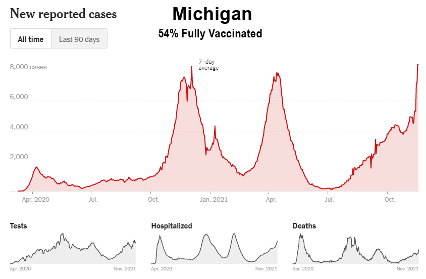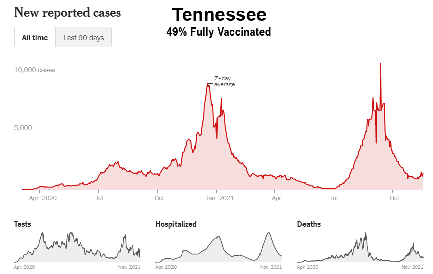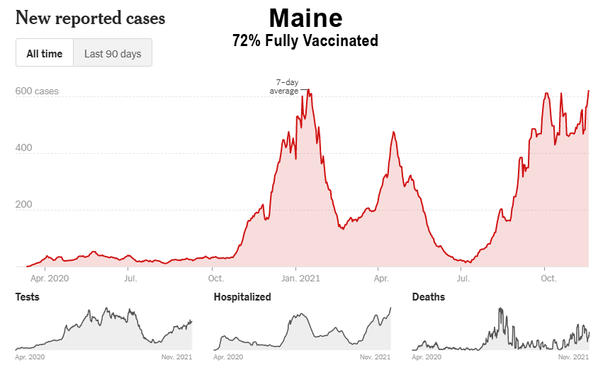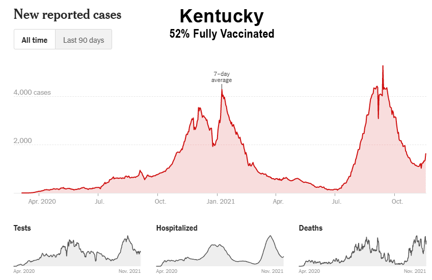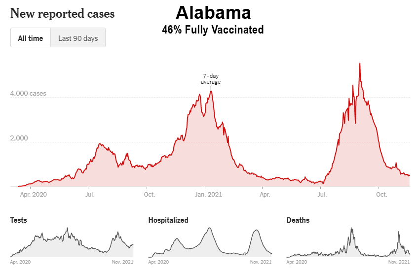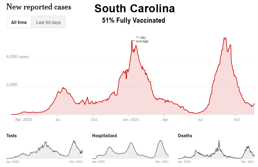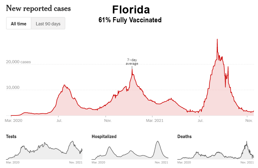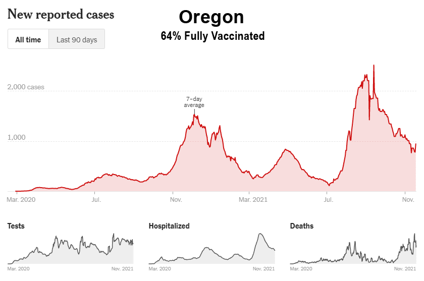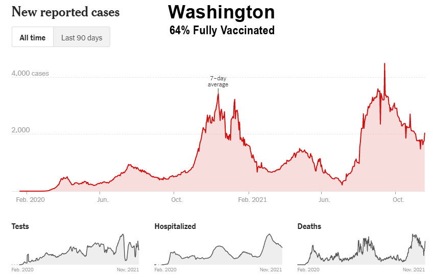 Comme le montrent ces données, malgré la campagne de vaccination de masse, la Floride, la Géorgie, l’Alabama, la Caroline du Sud, le Tennessee, la Louisiane, le Mississippi et le Kentucky ont tous connu leur plus haut niveau de cas entre les mois de juillet et d’octobre 2021. En outre, bon nombre de ces États du Sud ont également connu leurs plus hauts niveaux d’hospitalisation et de décès au cours de ces mêmes mois. Il est intéressant de noter que même les États de Washington et de l’Oregon, dans le nord-ouest du Pacifique, ont connu leurs pires mois (cas, hospitalisations et décès) jusqu’à présent, et entrent maintenant dans la saison hivernale de la grippe avec des niveaux de cas proches de leurs pics de 2020 :