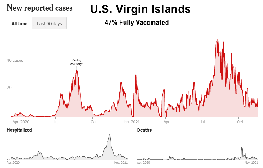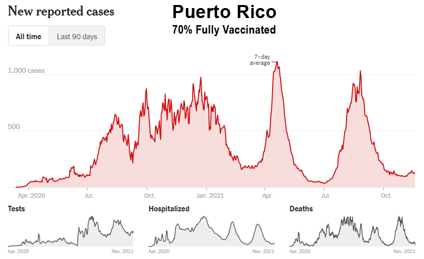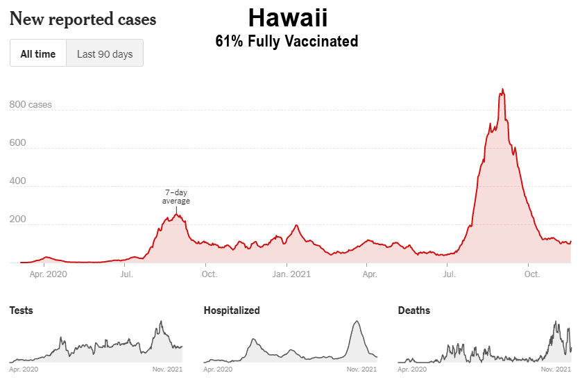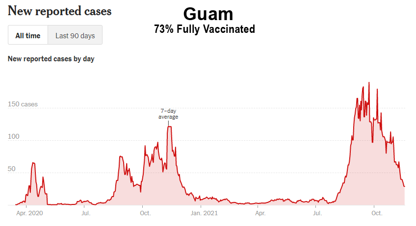 La campagne de vaccination n’a pas non plus réussi à ralentir la propagation sur les îles d’Hawaï, de Porto Rico, de Guam et des îles Vierges américaines, qui ont toutes connu des flambées record après la vaccination de masse :