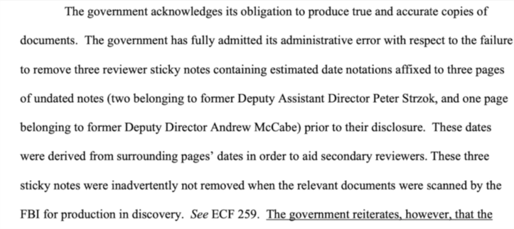 Le gouvernement reconnaît son obligation de produire des copies fidèles et exactes des documents. Le gouvernement a pleinement admis son erreur administrative en ce qui concerne le fait de ne pas avoir retiré trois notes autocollantes d’examen contenant des indications de date estimée, apposées sur trois pages de notes non datées (deux appartenant à l’ancien directeur adjoint Peter Strzok, et une page appartenant à l’ancien directeur adjoint Andrew McCabe) avant leur divulgation. Ces dates ont été dérivées des dates des pages environnantes afin d’aider les examinateurs secondaires. Ces trois notes autocollantes n’ont pas été retirées par inadvertance lorsque les documents pertinents ont été scannés par le FBI pour être produits au cours de la procédure de divulgation.