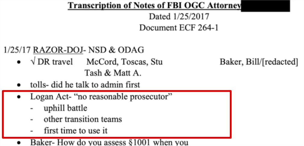 D’autres notes attribuées au FBI OGC Attorney (Avocat du « Office General Counsel » du FBI) sont très explicites. Ils n’ont rien contre Flynn, et le recours au Logan Act serait très difficilement justifiable dans ces conditions. (Le Logan Act est une loi fédérale des États-Unis qui criminalise la négociation par des citoyens américains non autorisés avec des gouvernements étrangers ayant un différend avec les États-Unis.)