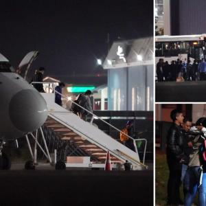 Alors que les policiers locaux se tenaient prêts, un groupe de 10 à 15 personnes portant des casquettes de baseball blanches assorties et des sacs de voyage est descendu de l’avion et est monté dans un bus charter près d’un terminal de fret inactif.