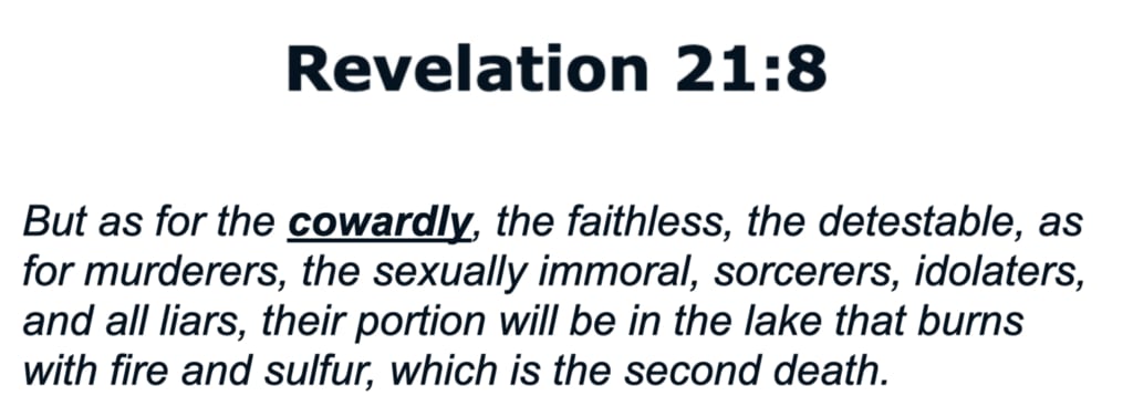 Les lâches sont les premiers sur la liste à être jetés dans l’étang de feu. Ne vous méprenez pas – je ne vous traite pas de lâche. Je vous montre que, même à la fin des temps, il veut que nous nous battions, que nous soyons les meilleurs et les plus courageux. Mieux vaut mourir dans ce monde que de connaître le sort réservé aux lâches. Dieu ne veut pas que nous soyons lâches, même si c’est la fin des temps.