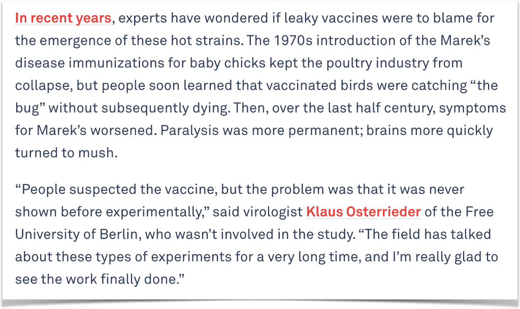 Ces dernières années, les experts se sont demandé si des vaccins non étanches n’étaient pas à l’origine de l’émergence de ces souches actives. Dans les années 1970, l’introduction des vaccins contre la maladie de Marek pour les poussins a évité l’effondrement de l’industrie de la volaille, mais les gens ont vite appris que les oiseaux vaccinés attrapaient le « virus » sans en mourir. Puis, au cours du dernier demi-siècle, les symptômes de la maladie de Marek se sont aggravés. La paralysie était plus permanente et le cerveau se transformait plus rapidement en bouillie.