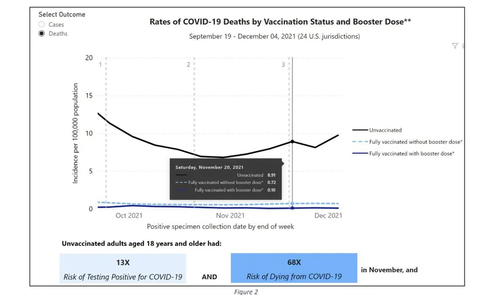 Voici l’affaire : Les personnes non vaccinées ont 97 fois plus de risques de mourir que celles qui sont vaccinées avec une dose de rappel.