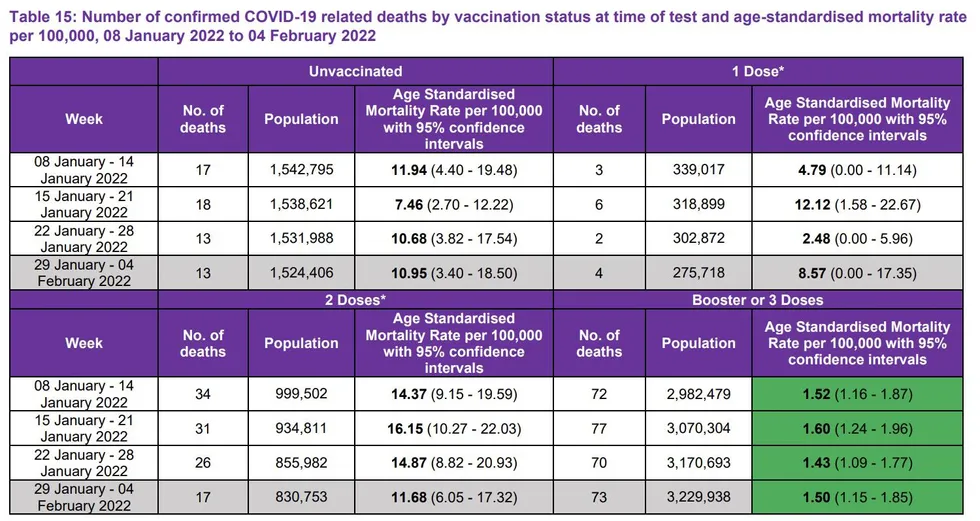 Il y a un énorme problème avec ces affirmations : Elles ne sont pas vraies. Non seulement elles ne sont pas vraies, mais elles ne correspondent pas du tout à ce que nous savons de l’efficacité du vaccin dans d’autres pays, comme l’Angleterre, l’Écosse et le Danemark, où la différence entre les taux de mortalité et d’hospitalisation pour les personnes non vaccinées et celles qui ont reçu une dose de rappel est de l’ordre d’un nombre à un seul chiffre.