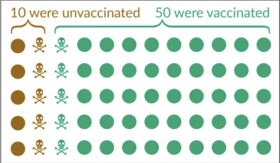Dans la figure ci-dessus, qui illustre un scénario hypothétique, on constate que 10 décès au total sont répartis équitablement entre les personnes non vaccinées et les personnes vaccinées, mais qu’il n’y a que 10 personnes non vaccinées au total pour 50 personnes vaccinées au total. Le résultat est un rapport de 5:1 entre les décès des non-vaccinés et ceux des vaccinés.