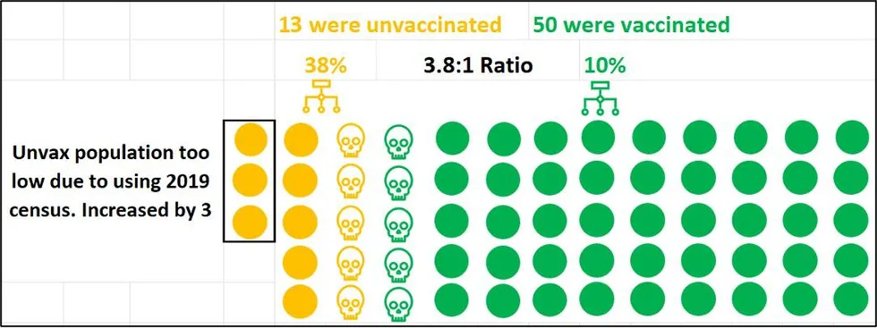 Bien que l’augmentation ne soit que de trois, les trois vont du côté des non-vaccinés, selon la méthode de calcul du CDC. Le CDC sait avec certitude combien de personnes ont été vaccinées, car ces données lui ont été communiquées par les agences sanitaires locales. Il doit estimer le nombre de personnes non vaccinées en soustrayant la population vaccinée connue de la population totale. Ainsi, chaque personne ajoutée au compte de la population totale est non vaccinée. Dans notre exemple, en augmentant la population totale de 5 %, on augmente la population non vaccinée de 30 %, ce qui réduit le taux de mortalité de 5:1 à 3,8:1.