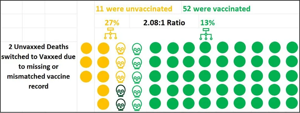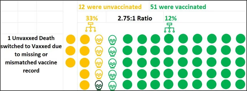 Cependant, certaines choses devraient être évidentes. Tout d’abord, la mise en correspondance des décès ou des hospitalisations avec un dossier de vaccination est un processus a) imparfait et b) qui prend du temps. Cela signifie que, inévitablement, les données compteront initialement au moins quelques personnes comme « non vaccinées » qui ont, en fait, été vaccinées, simplement parce que les dossiers n’ont pas encore été mis en correspondance. Et il est amplement prouvé, comme nous le verrons plus loin, que cela peut prendre des semaines ou des mois pour être fait correctement. Cela a pour conséquence évidente de fausser les chiffres des décès et des hospitalisations « en faveur » de la population non vaccinée, du moins lors de la publication initiale des données.