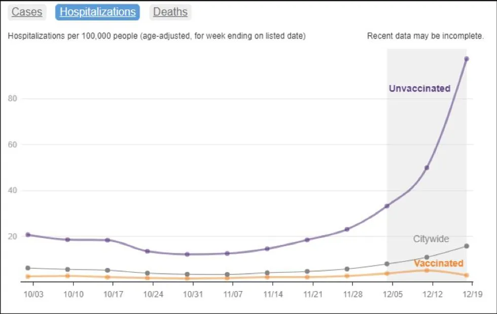 Lorsque j’ai consulté pour la première fois le site NYC Health COVID-19 Data, j’ai immédiatement remarqué la différence spectaculaire entre les taux d’hospitalisation des non-vaccinés (97,46) et des vaccinés (3,00), qui est de ~32,5:1 (Fig. 7). En plus de cet écart important qui ne semble pas plausible, j’ai également remarqué que la ligne des vaccinés semblait atteindre un pic la semaine précédente (12/12), alors que les non-vaccinés continuaient à monter en flèche. Cela n’avait aucun sens, ce qui m’a incité à chercher comment ces taux étaient calculés.