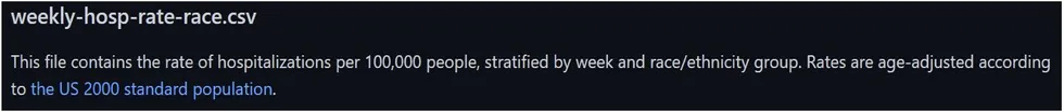 Ce fichier contient le taux d’hospitalisations pour 100 000 personnes, stratifié par semaine et par origine ethnique. Les taux sont ajustés par âge selon