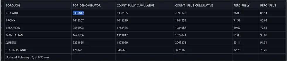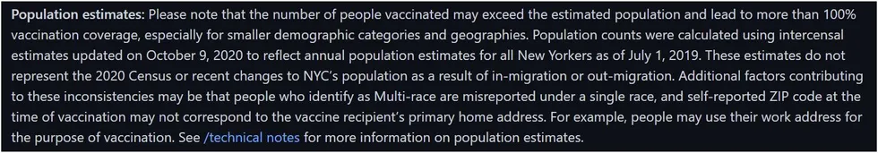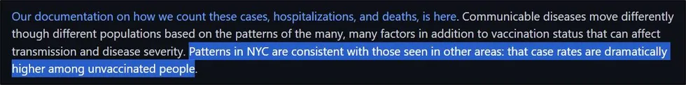 Toutefois, ce chiffre est bien inférieur à la population actuelle de NYC, qui est estimée à 8,85 millions d’habitants. Le recensement officiel de 2020 indique 8,80 millions, ce qui serait au moins une population plus raisonnable à utiliser que 8,34 millions. NYC Health a reconnu ce fait lors d’une communication avec l’auteur, mais a choisi de ne pas mettre à jour les mesures clés du taux en raison du fait qu’il ne dispose pas encore de toutes les ventilations démographiques granulaires :