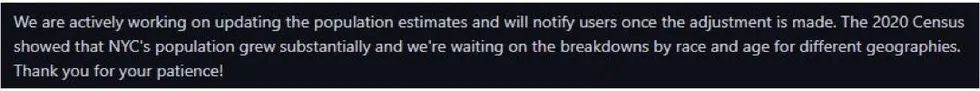 Nous travaillons activement à la mise à jour des estimations de la population et nous informerons les utilisateurs dès que l’ajustement sera effectué. Le recensement de 2020 a montré que la population de NYC a considérablement augmenté et nous attendons les ventilations par origine ethnique et par âge pour les différentes géographies. Merci de votre patience !