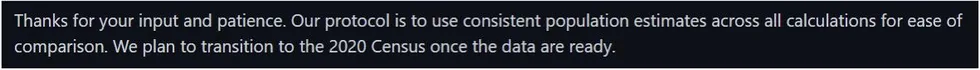 Merci pour votre contribution et votre patience. Notre protocole est d’utiliser des estimations de population cohérentes dans tous les calculs pour faciliter la comparaison. Nous prévoyons de passer au recensement de 2020 dès que les données seront prêtes.