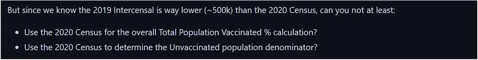 Cette méthode d’estimation de la population est supposée introduire des erreurs importantes dans le calcul du CDC. D’une part, plus l’estimation intercensitaire de la population s’éloigne d’un recensement réel, moins elle est présumée précise, et l’estimation intercensitaire de 2019 est aussi éloignée qu’on peut l’être d’un recensement réel avant qu’un nouveau recensement ne soit effectué. Deuxièmement, la population des États-Unis augmente chaque année, ce qui signifie que plus on s’éloigne de 2019, plus ces estimations deviennent erronées. Pour les cas de 2021, il y a eu trois années de croissance démographique qui ont été ignorées, ce qui signifie que le décompte de la population totale et l’estimation de la population non vaccinée sont tous deux erronés.