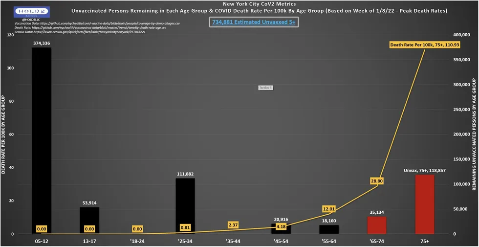 Il s’agit d’une mesure standard et appropriée à prendre lorsque les cohortes de comparaison présentent des distributions d’âge sensiblement différentes. C’est ce à quoi on peut s’attendre lorsqu’on compare des personnes non vaccinées à des personnes vaccinées, mais quelle pondération NYC Health applique-t-elle à ses données ? NYC a une distribution d’âge inhabituelle pour la cohorte non vaccinée, qui penche fortement vers les 65 ans et plus parmi les adultes. Par exemple, la figure ci-dessous montre la répartition par âge des personnes non vaccinées à New York, superposée au taux de mortalité du COVID pour les mêmes groupes d’âge dans la semaine du 8 janvier 2022 (pic de mortalité à New York).