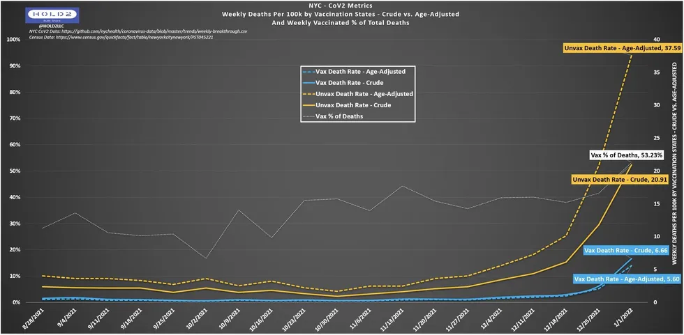 Étant donné que les personnes âgées ont été la première population à avoir accès au vaccin et que la vaccination des personnes âgées a été la priorité absolue de pratiquement toutes les agences de santé publique, ces distributions surprenantes remettent en question tout ajustement de l’âge utilisé par la ville de New York. Malheureusement, le département de la santé de la ville de New York ne publie pas les résultats du COVID en fonction de l’âge et du statut vaccinal. Nous ne savons donc pas comment le taux de mortalité beaucoup plus élevé des personnes âgées de plus de 75 ans est ajusté dans les taux de la ville de New York.